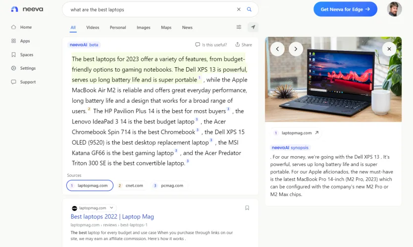 相反,尼瓦的利基市场是多站点搜索。想要一份最好的笔记本电脑清单吗?NeevaAI将告诉你,为你提供关于一两个段落的解释,并带有脚注。Neeva AI的回复下面是一系列链接,这样你就可以看到它来自的网站。