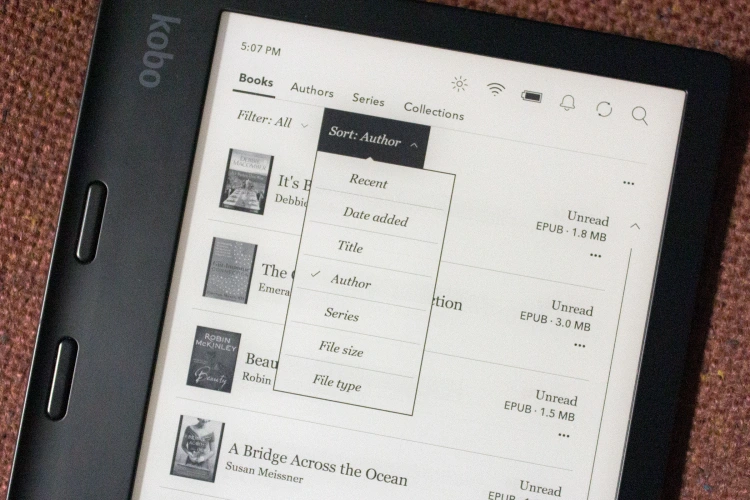 我也是我的书的陈列方式的粉丝。Kindle目前使用更精简的界面,看起来更干净,但在下拉菜单中隐藏了过滤和排序选项。虽然你可以像在Kindle上一样管理书籍,但Libra 2在屏幕顶部也有一个选项卡式菜单,可以让你立即查看一大堆书籍,或者按照你创建的作者、系列和收藏进行分组。在所有选项中,我通常发现Libra 2上想要的书速度更快,这要归功于更少的点击和滚动。