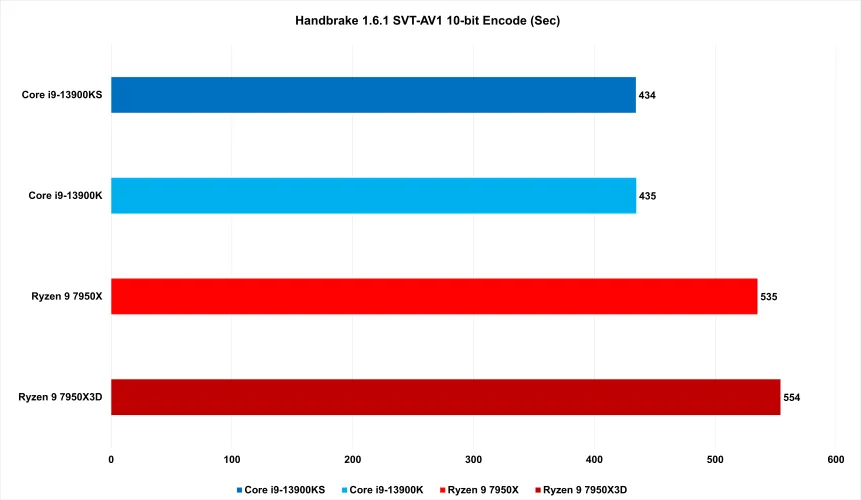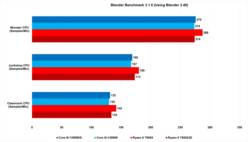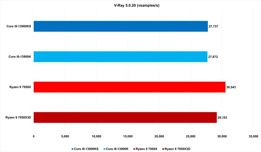 在繁重的工作负载中,7950X3D更能与这两款Team Blue产品保持同步。并不总是-Cinebench R23显示出略高于10%的性能差距。在手刹方面有一个显著的不同,7950X3D的速度慢了20%以上。但在V-Ray的光线跟踪基准测试和Blender的渲染测试中,7950X3D要么领先于13900K和KS,要么持平。