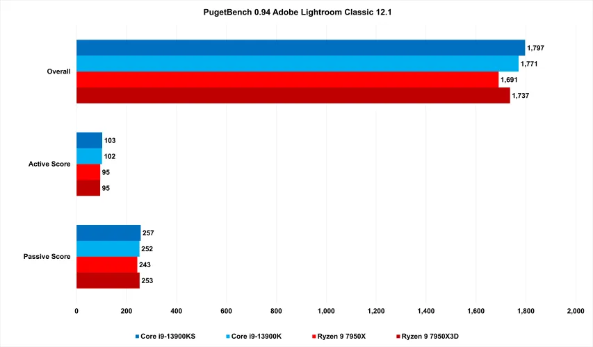 在PugetBtch的Adobe Photoshop测试中,差异并不是那么令人眼花缭乱;你看到的是近9%的下降。在Lightroom中,这一比例进一步缩小,差距约为3%。
