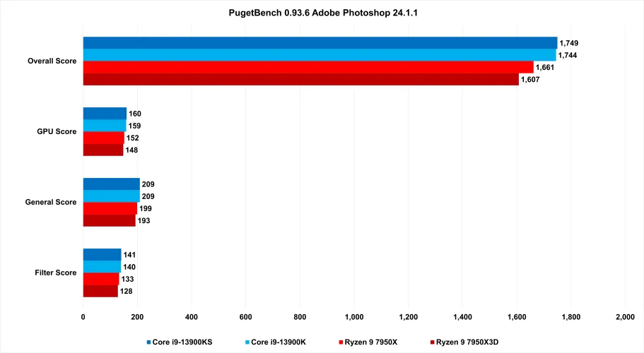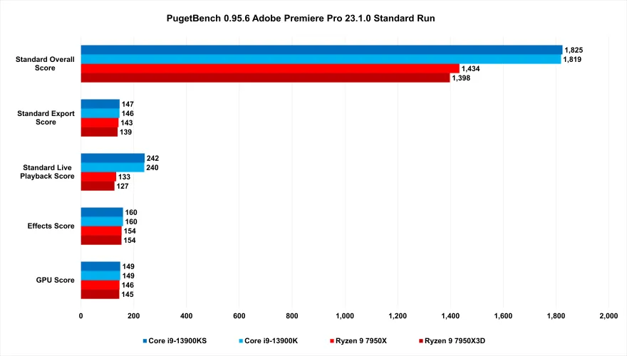 对AMD来说,不幸的是,Adobe的Creative Suite是一套许多人使用的应用程序,特别是那些对具有多核的大而结实的CPU感兴趣的人。虽然几乎没有人(如果有的话)预计Ryzen 9 7950X3D会提供7950X没有的数据,但其较低的性能是显而易见的。在PugetBtch的Adobe Premiere Pro Standard Run基准测试中,如果从13900K或KS切换到7950X3D,性能会下降30%。