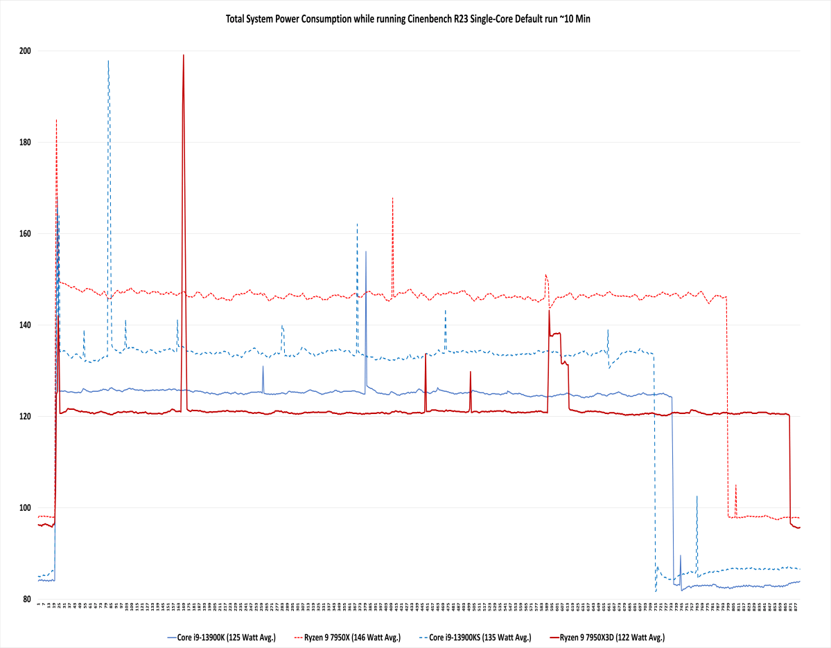 在我们的Cinebench R23多核测试中,7950X3D的系统总功耗比13900K降低了约31%,与更贪婪的13900KS相比降低了36%。它也比7950X下滑了近7%。对于单核基准,差距缩小到了更小的差距,但7950X3D仍然是胜利者。令人惊讶的输家:7950X,与英特尔第12代酷睿i9-12900K相比,我们在发布时称赞它的能效。
