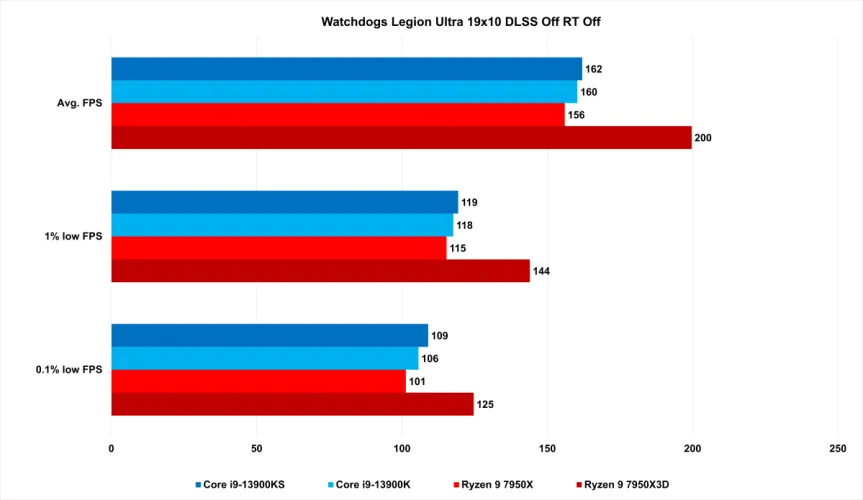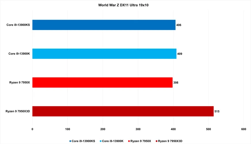 例如,以看门狗军团为例。在1080p的Ultra上,AMD Ryzen 9 7950X3D的性能比标准7950X提升了28%。Z世界大战的涨幅同样令人印象深刻,达到了29%。与13900KS和13900K相比,这一领先优势也保持不变。在Watch Dog Legion上,7950X3D比速度更快的13900KS增加了23%,比标准的13900K增加了25%。与此同时,在Z世界大战中,与13900K相比,它几乎跃升了27%,与13900K相比,跃升了26%。
