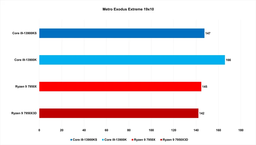 但另一方面,在Metro Exodus中,Ryzen 9 7950X3D相对于13900K来说拖后腿,性能下降了近15%。在赛博朋克2077中,它只是在13900K和KS面前站稳了脚跟,但仍然落后于香草非3D Ryzen 9 7590X约4%。