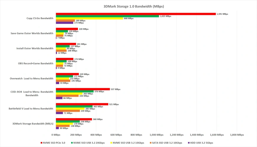 更常见的情况是等待游戏发布。运行内部NVMe驱动器仍然会更快,但差距会缩小一点。在三种流行的USB接口:USB 20Gbps、USB 10Gbps和USB 10Gbps上的SATA中,最快的是USB 3.2 20Gbps。使用USB 3.2 20Gbps固态硬盘,您可能会看到Battlefield V与USB 3.2 10Gbps驱动器相比,加载时间减少了25%。当然,表现也依赖于游戏。例如,《使命召唤》和《战场》在内部固态硬盘上的带宽都增加了45%左右,但图形强度较低的Overwatch,带宽增加了近30%。