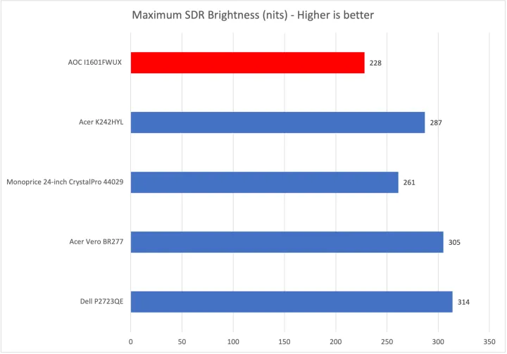 这款显示器的最大亮度为228尼特,略高于承诺的220尼特的峰值亮度。对于现代显示器来说,这是一个中等的亮度水平,尽管在这个价位上是典型的。