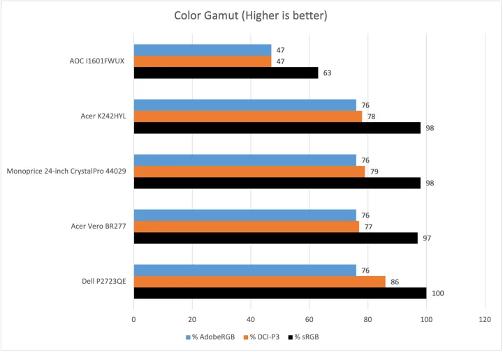 色域是I1601FWUX最明显的预算重点,因为它只覆盖了63%的sRGB和47%的DCI-P3。这一级别的色彩性能仅限于最便宜的显示器,与大多数显示器相比,它看起来明显更暗淡、更柔和。它很适合编辑文档或浏览网页,但在内容创作和娱乐方面就站不住脚了。