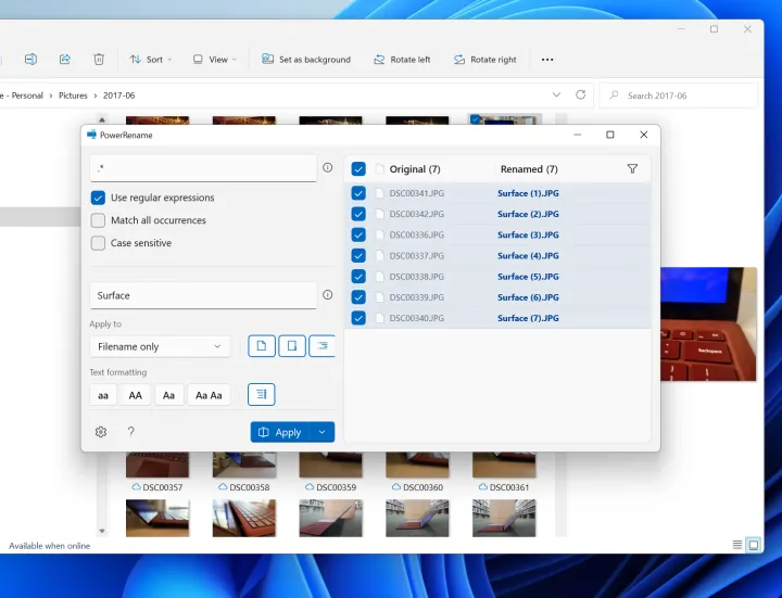 你可能不想对假期/活动照片进行微观管理,我也不想。但除了地点和拍摄时间外,云服务并不擅长对照片进行分组。使用PowerRename,你可以进入OneDrive,用鼠标套住一组照片,然后用PowerRename给它们重命名一些简单的名字,比如“EricElaineWayding”。该工具将为每张照片指定自己唯一的名称,如“EricElaineWayding4”。通过这种方式,您可以避免为每个事件创建特殊文件夹,并且该过程只需几秒钟–一旦您知道自己在做什么。