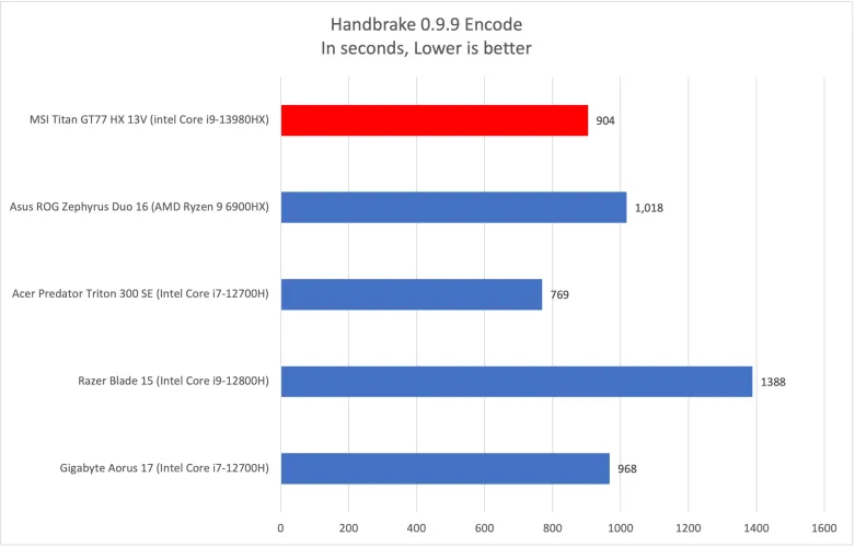 手刹是这里奇怪的鸭子,提供了一个很好的,但并不壮观的结果904。我对此感到有点困惑,但确实注意到手刹似乎没有完全饱和处理器的24个核心。酷睿i9-13980HX虽然令人印象深刻,但它确实严重依赖内核数量来击败竞争对手,所以任何不对所有内核征税的情况都会侵蚀它的利润率。