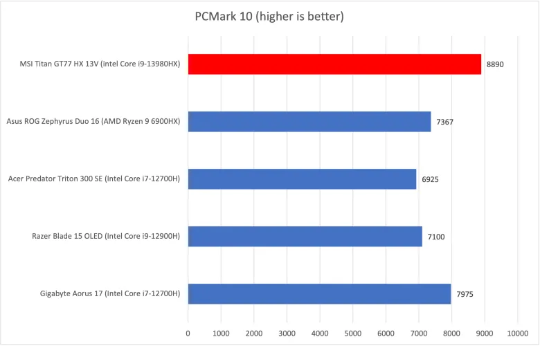 MSI在PCMark 10中以8890分的成绩脱颖而出,这是从笔记本电脑上记录的最高的PC世界。这并不令人震惊。新一代硬件提供更高的性能是正常的。尽管如此,泰坦显然名副其实,因为它在PCMark10的所有子类别中都取得了强劲的成绩。