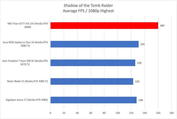 对于RTX 30系列笔记本电脑来说,《古墓丽影》没有那么尴尬,但与RTX 4090相比,它仍然遥遥领先。它平均每秒可额外传输约35帧,分辨率为1080p,细节设置最高。