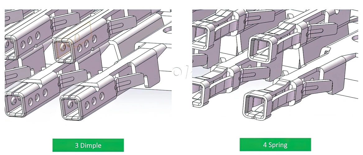 建议电缆插头内部的压接触点使用4弹簧设计,而不是3凹陷设计(如下图所示),这将增加12VHPWR连接器内电流的接触面积,并降低每个触点的温升。