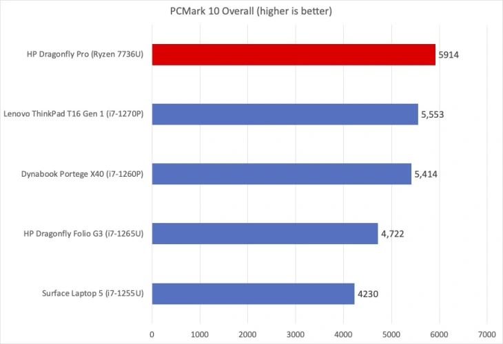 我们为每台笔记本电脑配备PCMark 10套件进行基准测试。这款软件为我们提供了一个很好的基准,使用日常任务来衡量计算机的真实性能。由于其8个强大的内核,惠普蜻蜓Pro与竞争对手基于英特尔的笔记本电脑并驾齐驱,并超过了12个内核。尽管这款笔记本很薄,但请放心,它的电量足以完成各种任务。