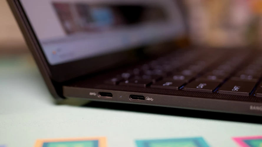 蜻蜓Pro至少让你有机会添加端口,这要归功于它的两个USB 4端口。它们与迅雷3标准兼容,并将允许您连接高速存储(高达40Gbps)、坞站和快速充电器。这两个端口位于电脑的左侧,带有一个小LED,让您知道笔记本电脑是否仍在从充电器获得电力。