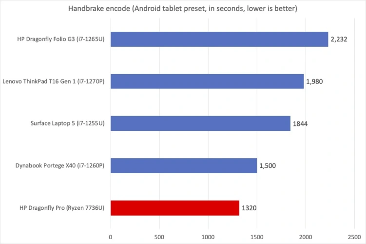 在我们最后的性能图表中,我们使用手刹,并对将一部高清电影转换为高度压缩的平板电脑友好文件所需的时间进行了计算。在最近的记忆中,惠普蜻蜓Pro能够比许多其他薄型笔记本电脑更快地启动并应对这一挑战,所需时间远远少于其他高质量笔记本电脑,如Surface Laptop 5及其表亲惠普蜻蜓Folio G3。