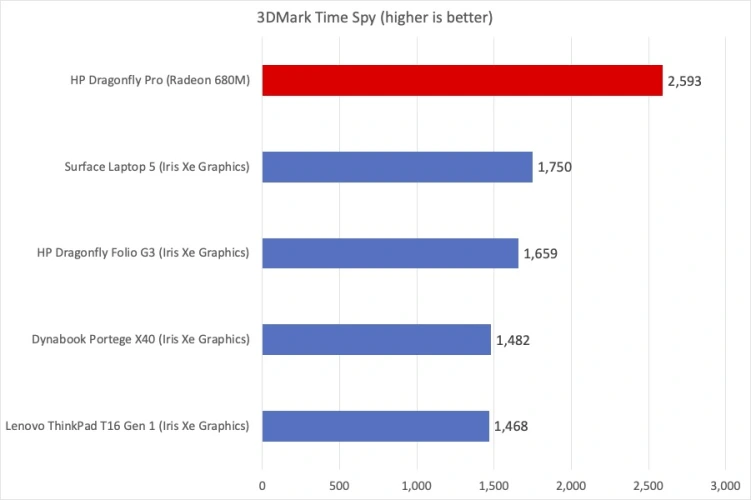虽然典型的英特尔超薄笔记本拥有比以往任何时候都更好的显卡,但AMD的Radeon内核仍然比它高出一截。在运行3DMark Time Spy基准测试时,惠普蜻蜓Pro在没有单独的GPU芯片的情况下展示了令人印象深刻的性能,使最近的英特尔Xe显卡测试结果相形见绌。