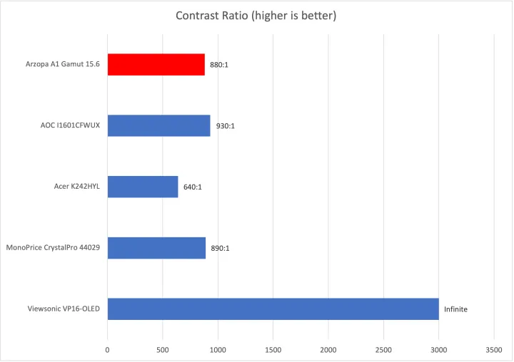 对比度为880:1。Arzopa A1色域可以提供一些深度感,但在黑暗场景中无法显示深而均匀的黑色。当显示器在昏暗的房间中使用时,这一限制最为明显,它会使照片、电影和游戏看起来平淡而模糊。