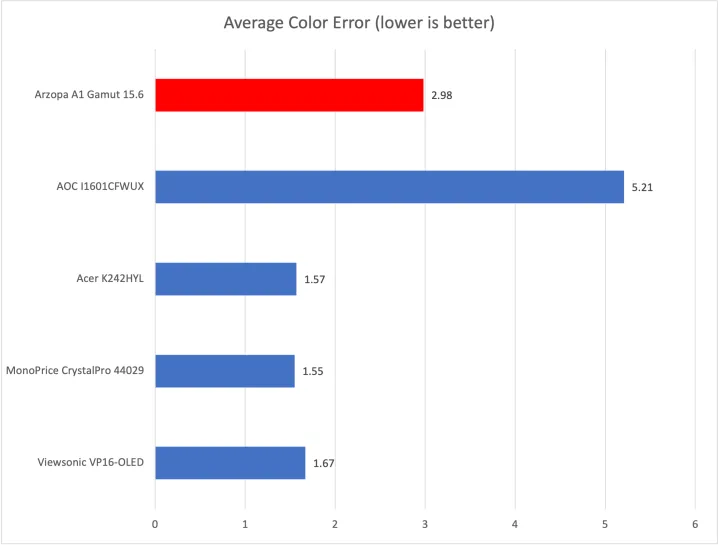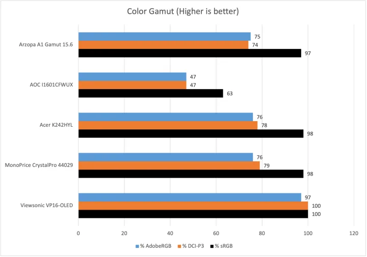 亮度达到了可观的最大值297尼特。这是比较中第二高的显示器,不仅击败了AoCI1601FWUX便携式显示器,还击败了宏碁K242HYL和Monoprice 44029这两款经济型24英寸台式显示器。Arzopa A1色域不够亮,不能在户外或阳光充足的窗户旁边舒适地使用,但除此之外,它还需要完成这项任务。