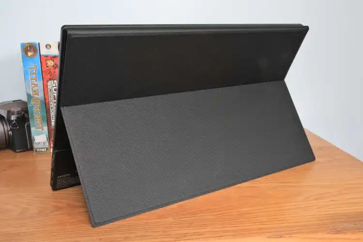 Arzopa选择了一款大部分是平坦的便携式显示器,在下半部分有一个小凸起来容纳显示器的电子设备。这或多或少已经成为便携式显示器的默认设计,将尺寸、重量和价格降至最低。显示屏覆盖着普通的塑料,但无光泽的表面似乎很适合旅行–以及不可避免的划痕和颠簸。