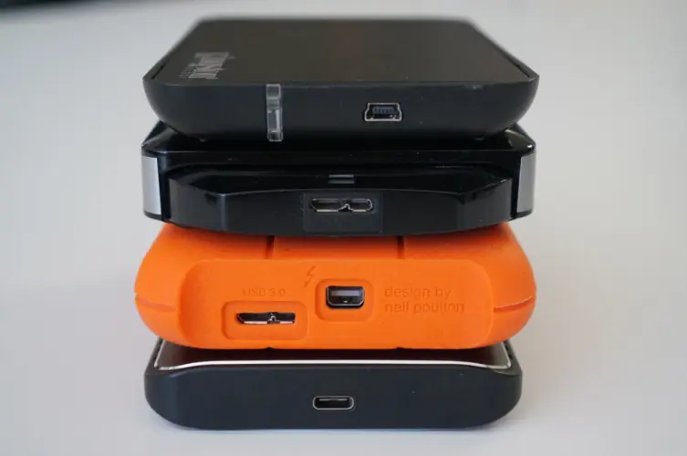顶部驱动器使用较旧、速度较慢的Mini-USB接口。第二个驱动器的特点是取代它的接口:Micro B SuperSpeed.橙色硬盘同时配备了超高速Micro B和迅雷2(迷你DisplayPort接口)。底部驱动器采用USB-C或USB Type C。