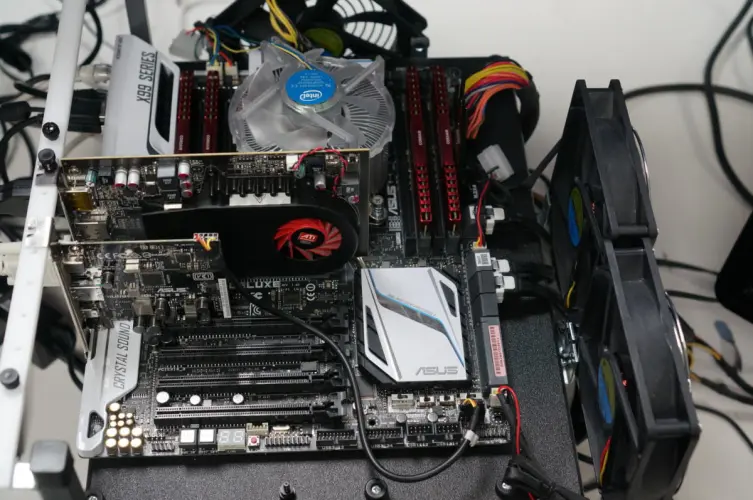 我们的存储测试台是酷睿i7-5820K,64 GB内存,安装在华硕X99豪华主板上。图中显示了较旧的华硕迅雷EX 3和ATI显卡。目前使用的是一块千兆阿尔卑斯岭迅雷卡和x2 NVIDIA 710 GPU卡。