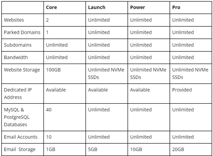 Launch、Power和Pro计划配备了无限的MySQL和PostgreSQL数据库。核心计划有40个,相比之下,Bluehost的相同计划类型有20个。
