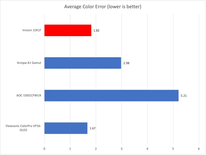 Innocn 15K1F的图像质量并不完美–但是,花269.99美元,这是很难抱怨的。事实上,我认为公平地说,在不到200美元的预算下,这是你所能期望的最好的图像质量。优派的ColorPro VP16-OLED表现优异,华硕的ZenScreen OLED型号也表现良好,但对伽马曲线或亚像素布局不挑剔的购物者将对15K1F充满活力的高对比度图像非常满意。