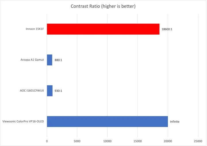 15K1F的最大对比度达到18,600:1。这是非常好的,尽管没有从优派录制的有效无限对比度高。有什么不同?优派的显示器达到了零尼特的最低亮度,而Innocn的显示器仅降至0.02nits。