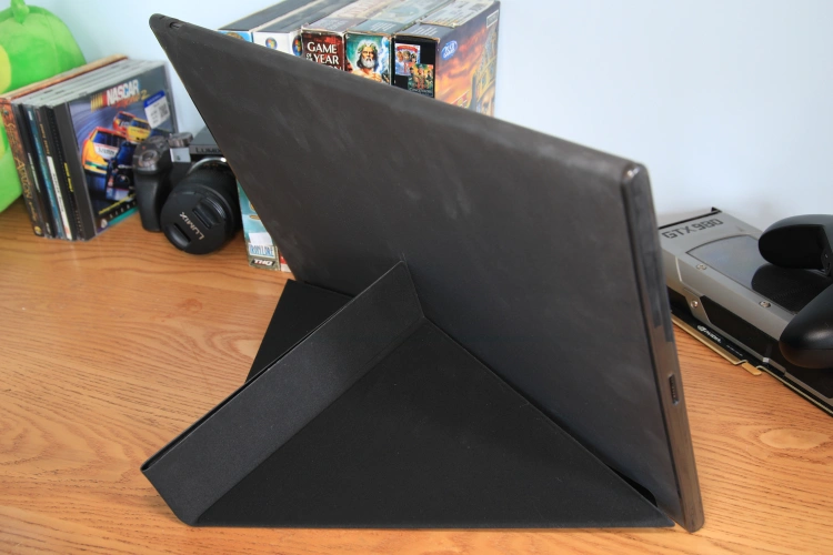 我希望我也能对证人席说同样的话。Innocn选择了一个塑料和人造皮革支架外壳,可以弹开并完全包围显示屏。它很硬,很难从盒子里固定下来。表壳可以很好地防止颠簸和擦伤,但塑料和假皮的材料质量仍有许多不足之处。两者都感觉便宜、薄,摸起来也不舒服。不幸的是,这削弱了显示器的优质结构。底盘是由坚固的金属制成的,但一旦装进支架外壳,你只能看到和触摸一层廉价的塑料。