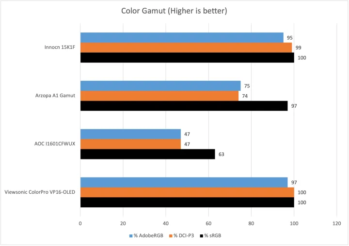 色域很强,覆盖100%的sRGB和99%的DCI-P3。优派更为昂贵的OLED再一次表现出色,但差别仍然很小,只有最有洞察力的用户可能才会关心。Innocn 15K1F提供了鲜艳、鲜艳的颜色,真的很流行。