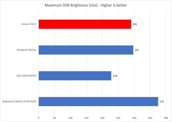 Innocn 15K1F没有宣传支持HDR,测试时也不接受HDR信号。这是最好的选择,因为显示器的最大亮度为290尼特,不足以达到HDR的要求,也不能提高亮度细节。HDR通常不适用于当前的便携式显示器,在配备高端OLED和Mini-LED面板的新机型面世之前,这种情况不太可能改变。