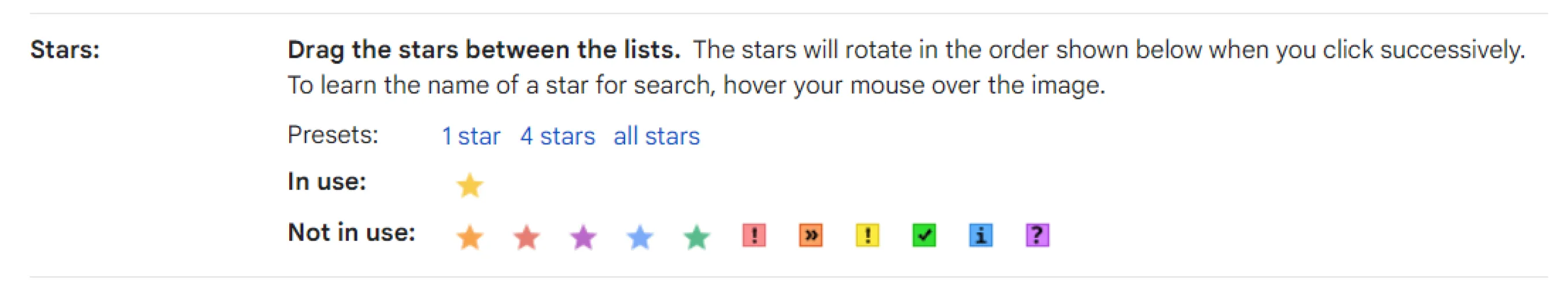 要扩大明星类型的阵容,请点击Gmail的齿轮图标,然后选择查看所有设置。在“将军”下,向下滚动到“星星”。默认情况下,“1星”选项将被选中,但您也可以选择“4星”选项(黄色和蓝色星、绿色复选标记和红色感叹号)或“所有星”(6颗彩色星,外加各种额外的6个图标)。在你选择了4星或全星选项后,当主演一封电子邮件时,请继续点击以在集合中循环。