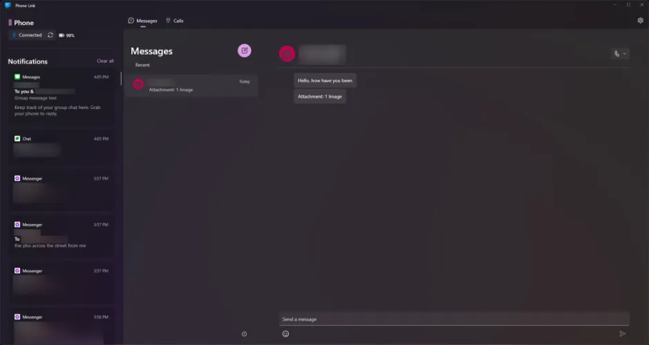 Windows 11上的消息同步目前是基本的。您只能通过Phone Link界面交换文本消息(短信和iMessage)–您需要在屏幕底部的文本字段中输入您的回复。传入的群、图片和其他媒体消息不会显示在对话主题中。相反,你只会在收到彩信时看到通知(如果你打开了该设置,还会看到文本的预览)。