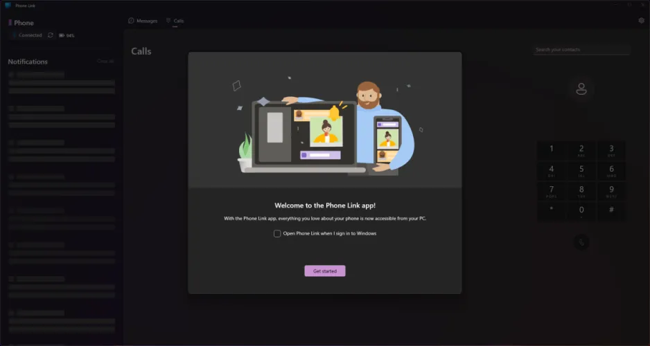 通过最终设置窗口后,您将看到Phone Link的主屏幕。它分为两个部分:左边的栏是运行的通知列表,而主要部分显示您的消息和您的电话。默认情况下,您将首先在Calls选项卡上启动。