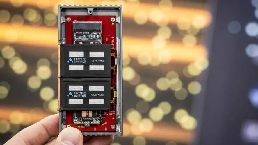 如果你还没有关注我们的报道,Airject使用了几层奇异的材料和精密的几何结构来振动微小的薄膜,吸入空气,在铜散热器上吹气,然后以每小时200公里的速度排出空气。一个很小的AirJet Mini单元,大约几张邮票的大小,可以取代十倍于其大小、数倍于其2.8 mm厚度的主动冷却器。