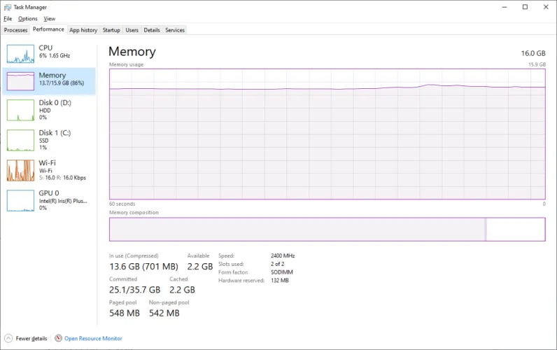 要查看您使用了多少内存,请启动Windows任务管理器(Ctrl+Shift+Esc),然后进入性能标签。第二个条目是您当前的RAM使用情况。在上面的示例屏幕截图中,使用四个不同的浏览器(每个浏览器至少有12个选项卡)加上Microsoft Excel占用了可用16 GB内存的86%。