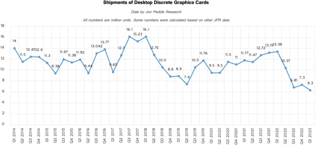 如果你跟上了PC构建论坛上的讨论,你可能已经感觉到了目前对独立显卡的冷淡。现在有数据支持这种直觉印象。Jon Peddie Research的分析师发布的一份新报告显示,与上一季度相比,2023年第一季度的出货量下降了近13%,同比下降了近40%。
