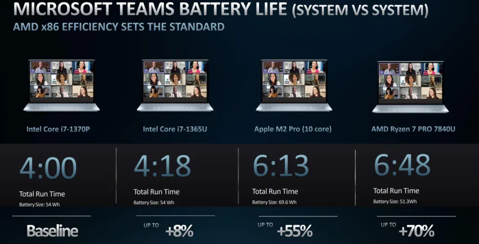 AMD还认为,Ryzen Pro 7040处理器在商用电脑方面有几个优势。例如,AMD声称已经通过微软团队长达数小时的通话进行了测试。它自己的笔记本电脑使用时间最长,甚至超过了苹果M2 Pro,并轻松地比它高出5%到18%。