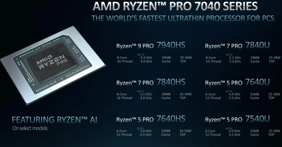 AMD的新商用Ryzen 7040处理器包括Ryzen 9 Pro 7940HS、Ryzen 7 Pro 7840HS、Ryzen 5 Pro 7640HS,以及三个U系列芯片:Ryzen 7 Pro 7840U、Ryzen 5 Pro 7640U和Ryzen 5 Pro 7540U。最快的Ryzen 9 Pro 7940HS包括8个内核和16个线程,从4.0 GHz的基时钟提升到5.2 GHz。标准的Ryzen 7040移动芯片和新的Ryzen Pro系列之间的不同之处在于安全性-内部有一个集成的Pluton核心-以及额外的可管理性功能。