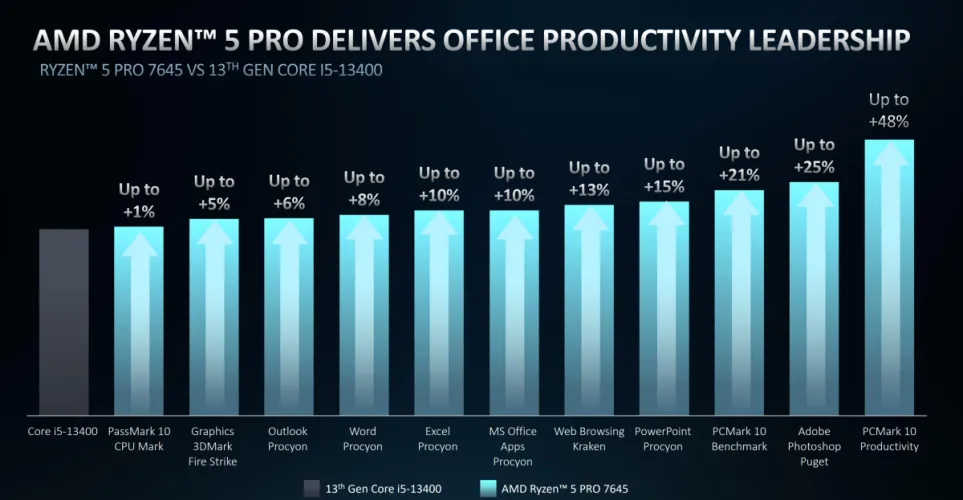 从性能的角度来看,AMD声称其新的Ryzen Pro芯片将在性能方面与英特尔的第13代移动处理器展开有利的竞争,甚至可以用自己的低功耗“U”核挑战英特尔的第13代“P”性能处理器之一。