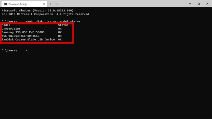 结果应该类似于这里的图像。最好询问型号和状态,以便在报告问题时可以更快地确定哪个驱动器出现故障。对于笔记本电脑来说,这并不是什么问题,但对于配备多个驱动器的台式机来说,这很有帮助。