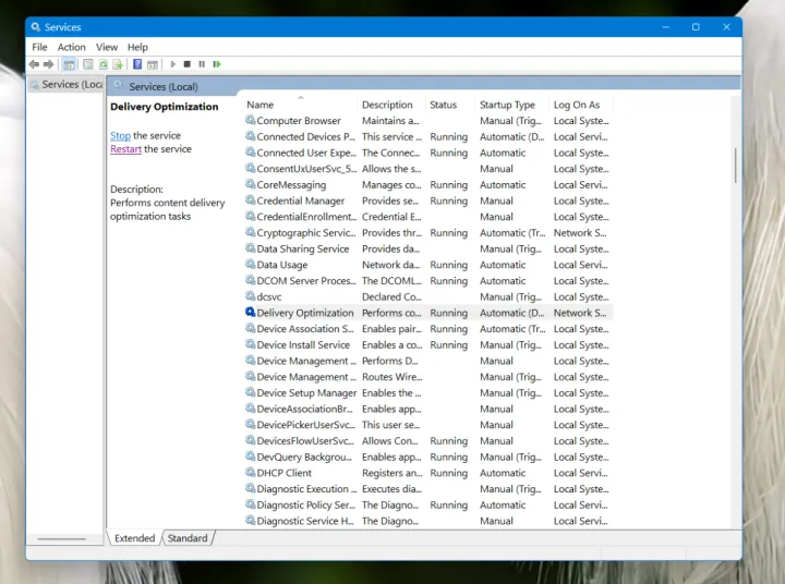 有两种方法可以帮助确定Delivery Optimation是否正在运行:首先,打开Run菜单(Win+R)并输入services.msc。您应该会看到PC上的服务列表以及它们的状态。服务窗口将Delivery优化服务标识为正在运行,并设置为自动开始。所以,运气不好。