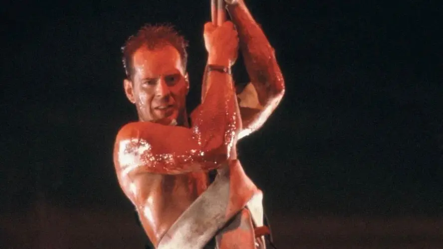 在一架直升机上,纽约警察约翰·麦克莱恩(布鲁斯·威利斯饰)被联邦调查局特工误认为是恐怖分子,他不顾一切地想从中富大厦的屋顶上下来,这座大楼被布置成了爆炸装置。在无处可去的情况下,麦克莱恩把自己绑在消防水龙上,在屋顶点燃时跳下大楼,摧毁了直升机。麦克莱恩摇摇晃晃地站在大楼的一侧,冲进去,设法挣脱了自己,差点被掉落的软管拖了下来。