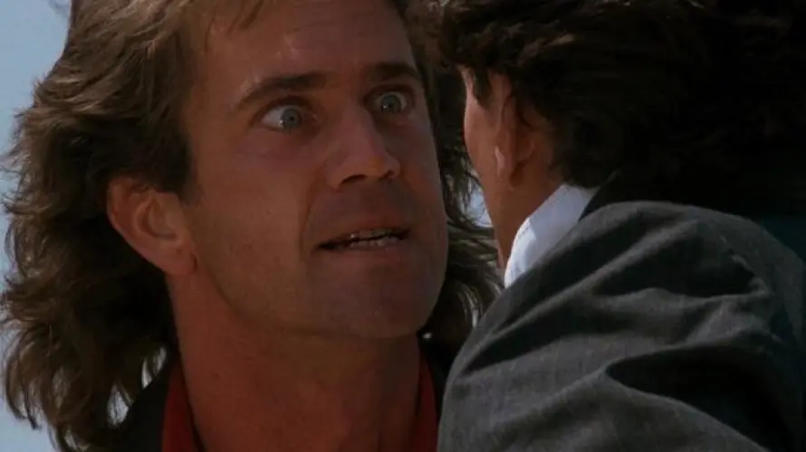 有时最好的动作场面是让观众洞察角色的场景。在29分钟的时候,Murtaugh(丹尼·格洛弗饰)和Riggs(梅尔·吉布森饰)接到一个电话,说有人跳楼了。里格斯把自己铐在跳伞者身上,迫使这个突然不情愿的人离开大楼,进入下面的一个巨大的安全气囊。这一幕扣人心弦,表明里格斯并不害怕死亡,可能有点疯狂。