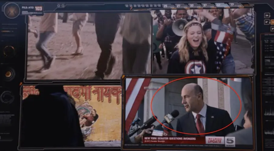 我们在新闻短片中看到的参议员是博因顿参议员。作为漫画中托尼·斯塔克的敌人,博因顿试图获得钢铁侠盔甲,并想通过火力计划创造自己的版本。