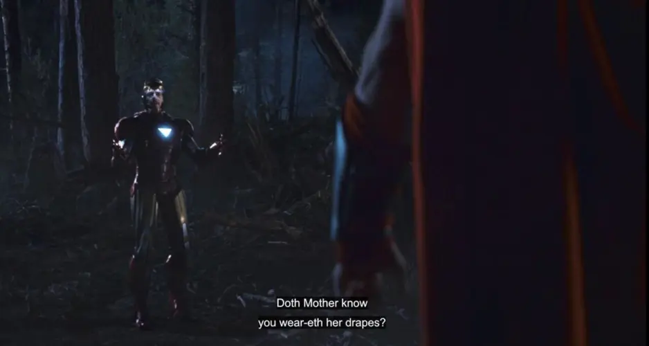 “妈妈知道你穿她的窗帘吗?”是唐尼即兴创作的一句台词,他在公园里重复了之前提到的莎士比亚。唐尼以这种即兴创作而臭名昭著;当电影制作人开始拍摄时,第一部钢铁侠电影还没有完成剧本。