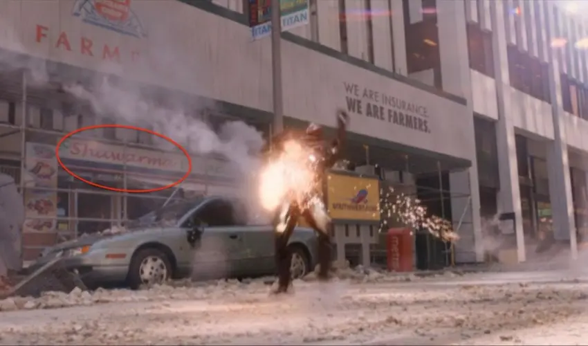 在电影的结尾,托尼说他看到了一家沙瓦玛餐厅,他想去尝尝。在这张照片中,你可以看到打斗时背景中的餐厅。
