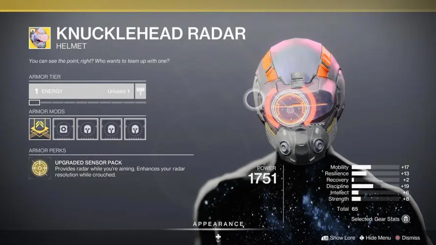 我们已经在Xur的库存中看过几次Knucklehead雷达,但这个版本有一些非常好的统计数据,使它脱颖而出。机动性、韧性和纪律性在这场比赛中占据了最大的份额,如果你计划在这个周末做一些PVP,这使得克努克尔黑德雷达在一些在线竞争中非常棒。它的关键好处,升级的传感器包,也很适合这种环境,因为你会在蹲着的时候增强雷达,在你瞄准的时候它会激活。对于想要随时了解周围环境的射手猎人来说,这是完美的选择。