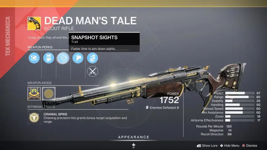 除非你的收藏中还没有这本书,否则这周你可以跳过《死人的故事》。快照视线可以让你更快地瞄准视线,这是一个非常标准的额外功能,而本周剩下的额外功能在这一部分并不能提供任何真正的协同效应。增加装填速度的轻型弹丸和增加稳定性的复合库存都不坏,但我们在过去看到了徐尔更好的滚动。