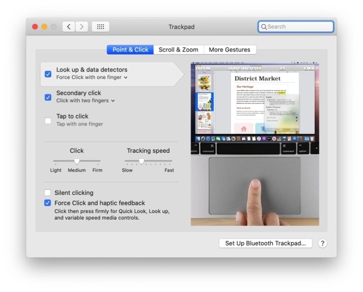 要使用Force Click,你需要2015年或更高版本的MacBook或MacBook Pro,2018年或更高版本的MacBook Air,或者Magic TrackPad 2。在系统偏好设置>触摸板中进行设置,确保启用了查找和数据检测器以及Force Click和触觉反馈。